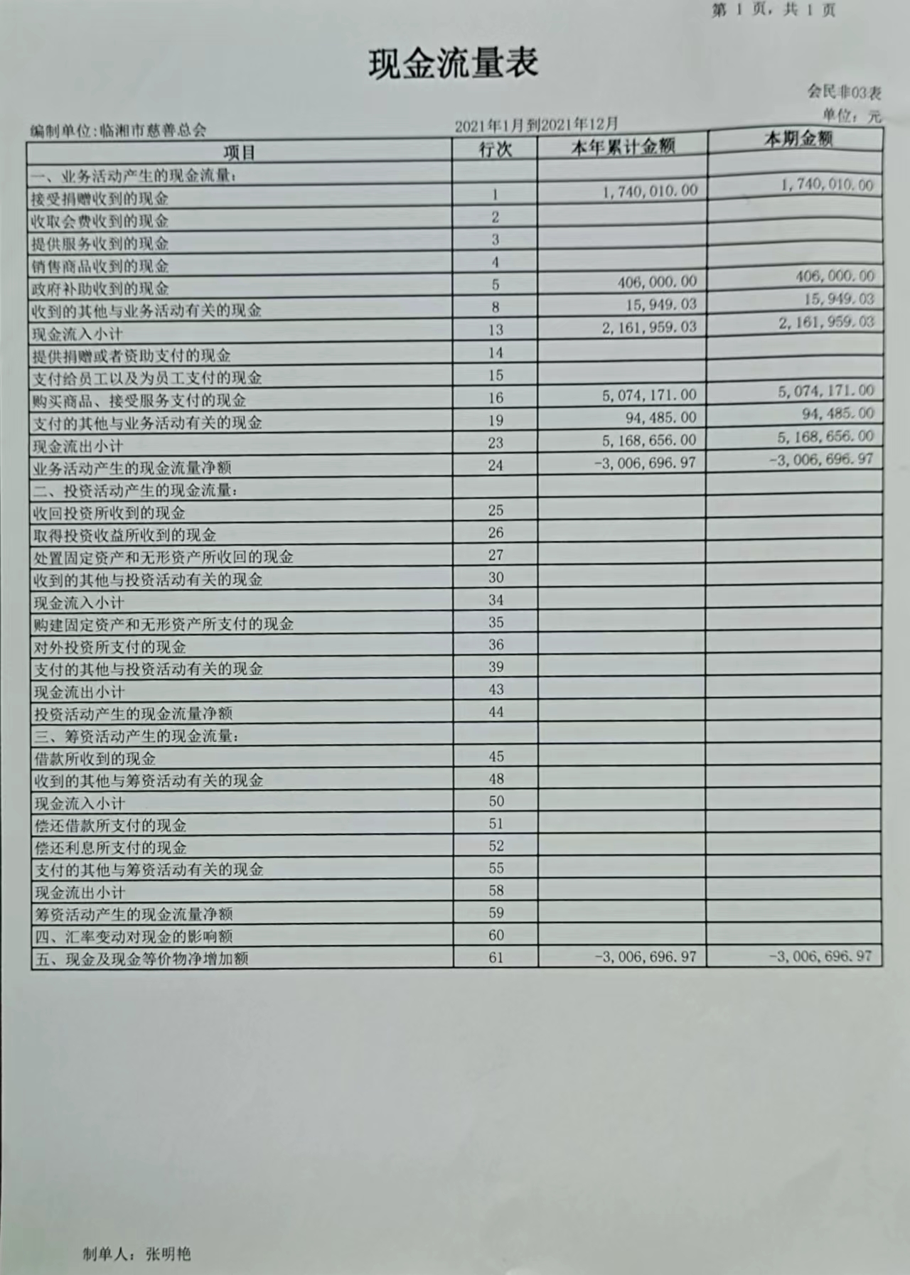 临湘市慈善总会2021度现金流量表