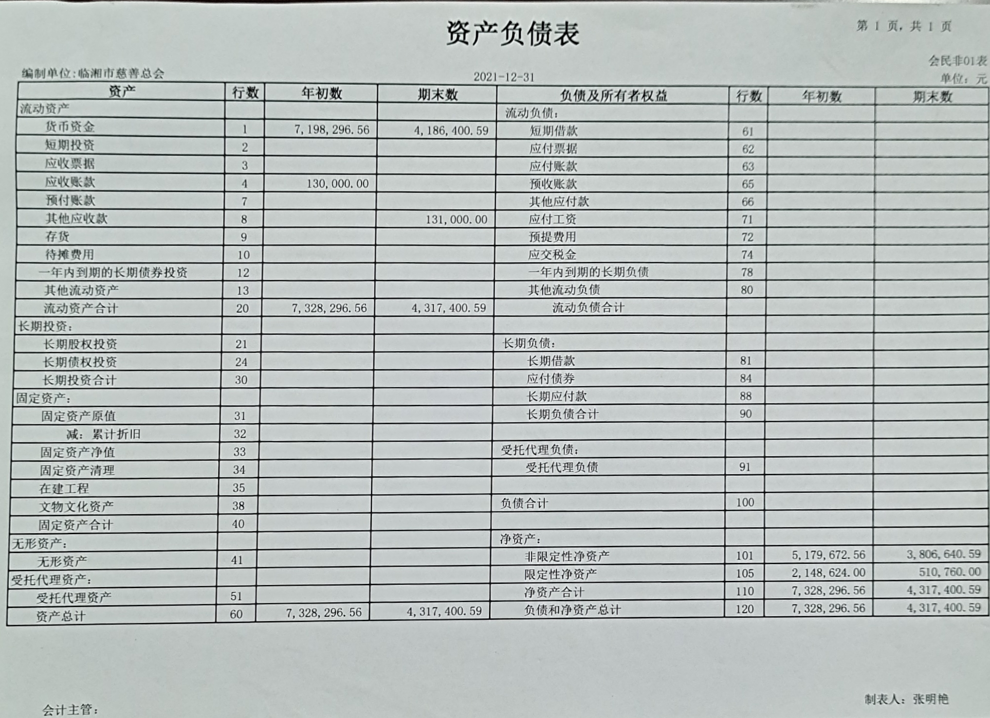 临湘市慈善总会2021年度资产负债表